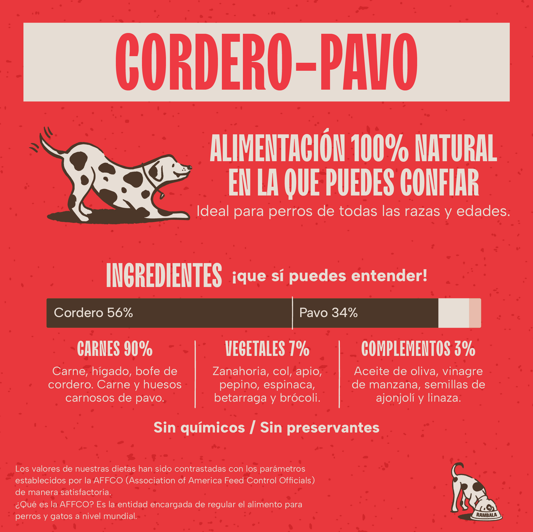 Rambala ® Cordero Pavo es un alimento 100% natural que contiene grasas de alta calidad, gracias a las cuales los músculos y órganos se mantienen en óptimas condiciones. Es también una gran alternativa para perros con problemas de alergias.