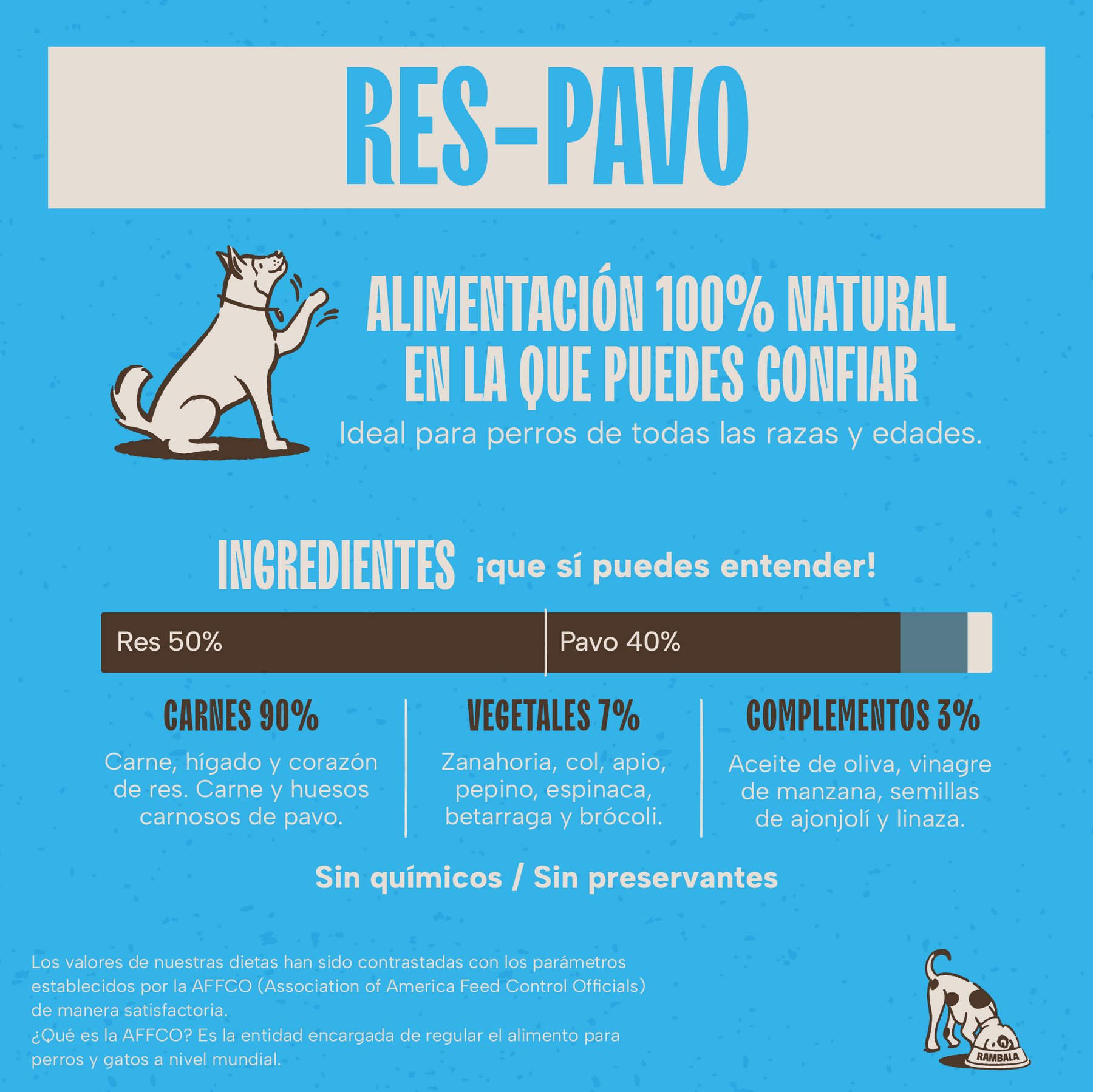 Rambala ® Res-Pavo es una fórmula preparada con dos tipos de carnes para mantener una dieta variada y bien balanceada. Es perfecta para ganar peso, tiene un alto nivel de proteínas y es rica en vitaminas, como la B12. En caso de ser alérgicos al pollo, esta es la dieta ideal para ellos.